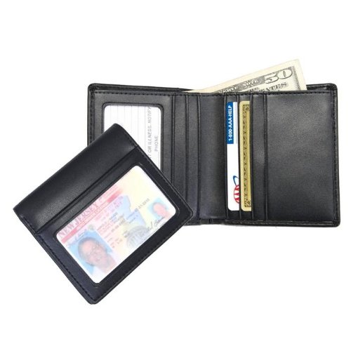 Double ID Bi-Fold Men's Leather Wallet. Inside, theres plenty of room for currency. Genuine leather wallet with front ID window, interior ID window, 4 turned-edge credit card pockets, 2 additional pockets and a 6-flip insert that securely holds your credit cards, license and photos. Currency compartment is lined in striped moir fabric. Wallet is 3 5/8" x 4".Customer Reviews