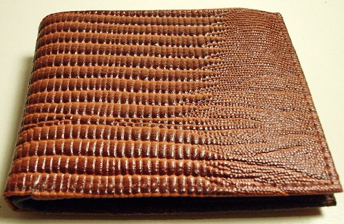 Smooth brown lizard skin pattern genuine leather hand made wallet. Flip up ID pocket inside. Several slots on each side. Leather divider for separating paper money. Spare key holder inside.Customer Reviews